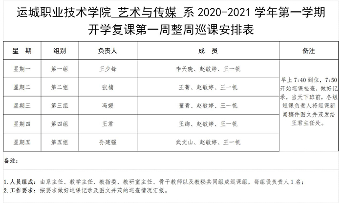 9月4日,艺术与传媒系召开了新学期系部工作会议,系主任孙建强对新学期教育教学、防疫、招生等工作进行了统一的部署,着重对即将开始的新学期第一周进行“巡课”、“开学第一课”工作支持,系部制定了“整周巡课安排表”,相关教师落实具体工作,各专业教师做好本职授课任务。