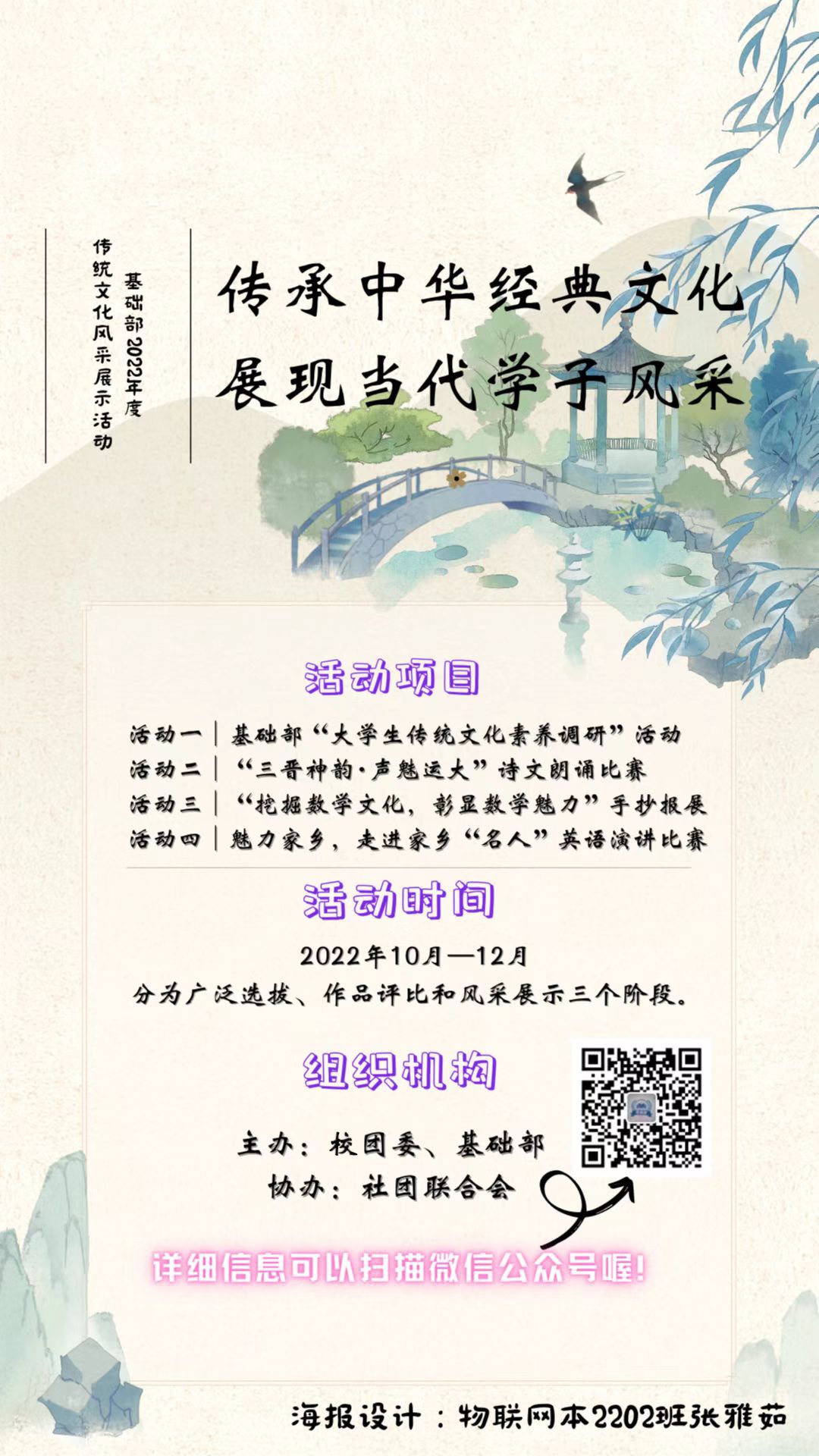 为促进基础部教学改革,提升学生公共基础课程学科核心素养,加深学生对中国传统文化的认识与传承,丰富校园文化,增强学习氛围,为学生提供展现自我与提升自我的平台,特举办本次活动。
